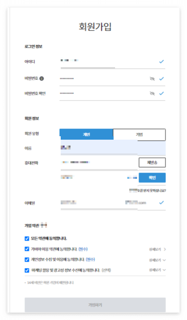 - 회원유형에 개인을 체크하시고 핸드폰과 이메일 인증을 해주세요.