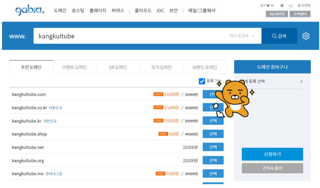 - 여기에 여러가지 도메인이 나오는데 저는 .com으로 끝나는 kangkultube.com을 선택했습니다.