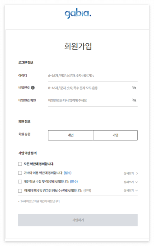 - 약관동의에 체크하시고 가입하기 버튼을 누르시면 회원가입이 완료됩니다.