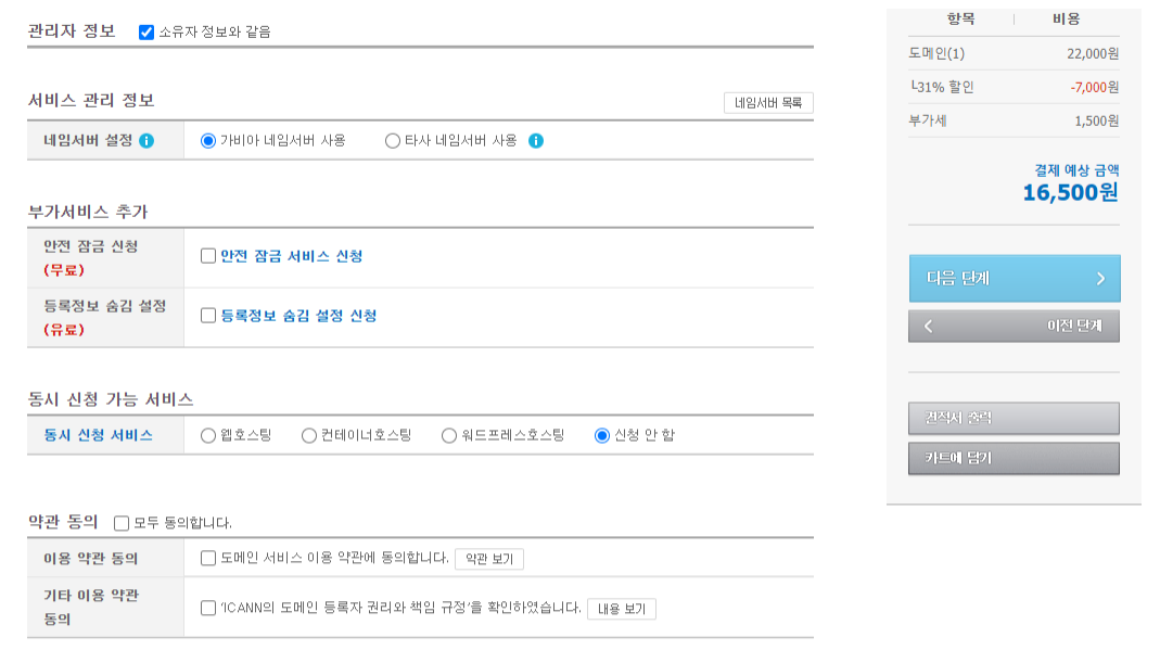 - 그리고 도메인 장바구니에 도메인이 들어간 것을 확인하시고 신청하기 버튼을 눌러주세요.