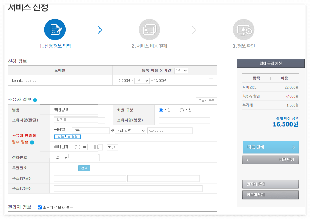 - 등록기간은 1년으로 바꿔주세요. 나중에 연장할수 있으니까 처음에는 조금 싸게 이용하세요.