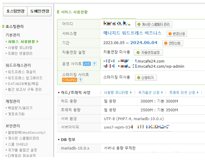 - 가운데 보시면 "내주소. mycafe24.com" 이 있습니다. 이 주소가 내 워드프레스 주소입니다.